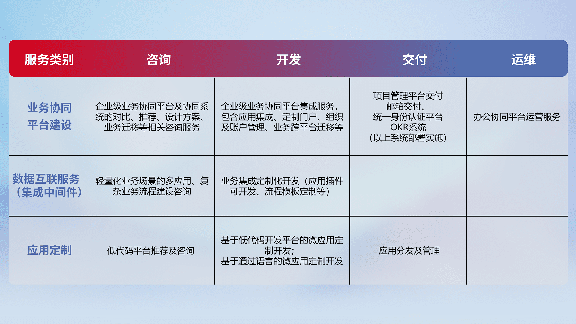 针对钉钉、、企微、、IDaas等平台级产品提供产品的规划、、、方案、、、、交付、、定制化开发等服务,,实现如统一协同办公、、智能客户服务、、、混合会议管理、、、、智能数据查询、、、、等业务场景,,,,实现数字化转型。。。