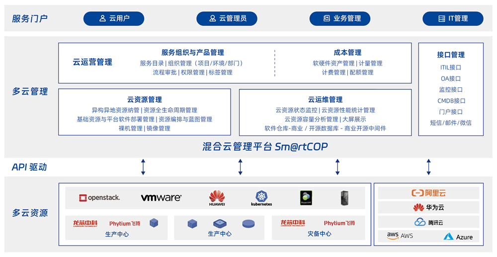 面向各行业用户多云资源管理、、、、运维及服务提供的综合挑战,,提供异构异地异芯片多云资源的统一管理、、、、统一运维、、统一监控及统一运营服务,,,,简化多云管理复杂度,,,提升用户用云满意度,,,释放云平台业务价值。。。。