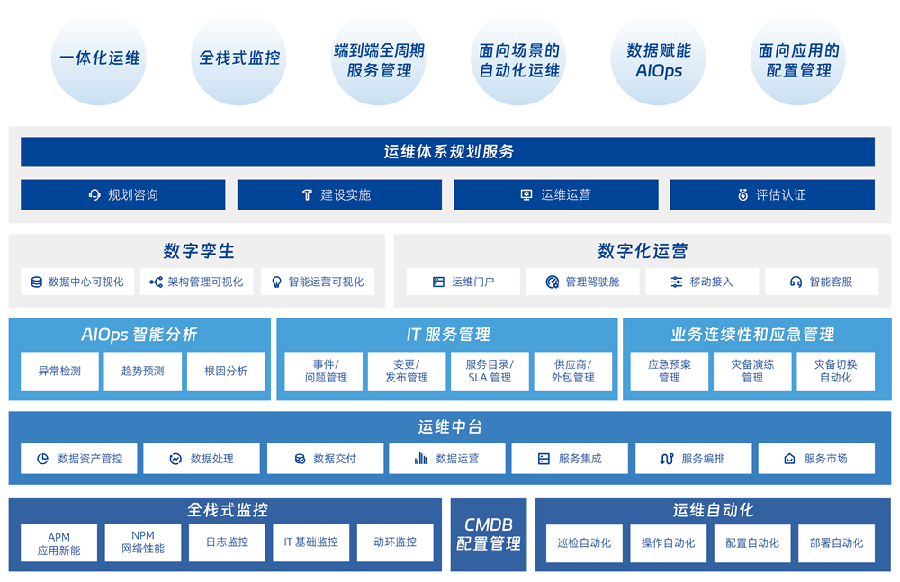 针对数字化时代对运维管理的需求,,,自主研发的“监管控析”一体化智能运维解决方案。。。。平台以客户和业务场景为导向,,,,通过全业务的数据和流程整合,,同时支持传统 IT 架构和云技术架构的“双态 IT”运维,,实现可视化、、场景化、、、自动化、、、精细化的智能运营管理,,,提升用户体验及运营效率,,助力内外部生态的数字协同和价值创造。。。